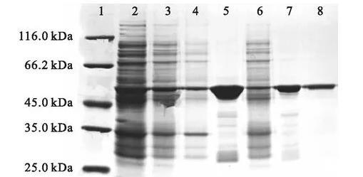 圖1失活型VhPLD的表達與純化SDS-PAGE電泳圖注:1.蛋白marker;2.菌體破碎液;3.菌體破碎後離心所得上清液;4.菌體破碎後離心所得沉澱;5.鎳柱純化所得100 mmol/L咪唑洗脫峰樣品;6.鎳柱純化的上樣穿過峰樣品;7.G-25柱純化的洗脫峰樣品;8.Q柱純化的300 mmol/L氯化鈉梯度洗脫峰樣品。