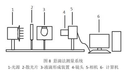 懸滴法的原理是利用液滴靜止懸掛在毛細管的管口處時,液滴的外形主要取決於重力和表麵張力的平衡。通過測定懸掛著的液滴的外形參數,可推算出液體表麵張力。懸滴法的測量試驗係統主要由光源、散光片、液滴形成裝置、鏡頭、相機、計算機等組成。測試步驟也很簡單,不需要清洗儀器,製樣完成後,接通電源,調節控溫器使溫度達到預設溫度點。將裝好試樣的石英比色皿和注射器置於恒溫室中,針頭必須保持垂直。一般液體恒溫時間為 30 min。控製注射泵進樣成滴,當液滴接近最大直徑時,按動快門,記錄液滴圖像,將攝影膠片印製成圖像。該檢測方法表麵張力測定精度也是±0.1% 。此外要注意管尖的口徑不能過大以致生成大懸滴,溫度波動會產生對流和振動,使懸滴不穩定。