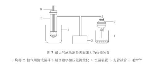 最大壓力氣泡法的原理是將毛細管端浸入液中,通過增加內壓便產生氣泡,然後從管端成長的氣泡的最大泡壓可求出液體的表麵張力。 最大壓力氣泡法使用的儀器主要為燒杯、抽氣用滴液漏鬥、精密數字微壓差測量儀、恒溫裝置 、支管試管、毛細管等。檢測步驟當然也先製樣,然後清洗儀器,之後檢驗儀器,調節毛細管或液麵高度,使毛細管口與水麵相切。打開活塞抽氣,調節抽氣速度,使氣泡由毛細管尖端成單泡出,且每個氣泡形成的時間約為 6s-10s。在形成氣泡的過程中,液麵半徑經曆:大→小→大,同時壓力差計指示值的絕對值經曆:小→大→小的過程,記錄下絕對值最大的壓力差三次,取其平均值。最大壓力氣泡法每次測量前應注意:一定要用待測溶液清洗支管試管和毛細管,並振蕩洗滌。