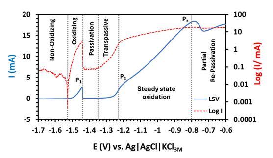 圖1電化學線性掃描伏安圖(LSV,藍色實線)及液滴電流的對數圖(紅色虛線),針對1 M NaOH中的镓銦合金,掃描速率為0.5 mV/s。垂直虛線將圖中標記的六個反應區域區分開來,標記出三個氧化峰P1、P2和P3。