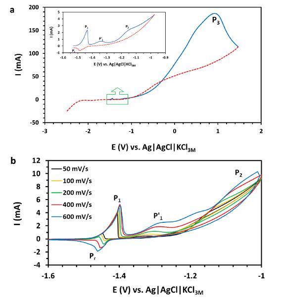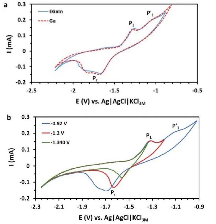 圖2(a)在300 mV/s掃描速率下,镓銦合金液滴在1 M NaOH中的循環伏安圖。(b)不同掃描速率(50至600 mV/s)下的镓銦合金液滴循環伏安圖。