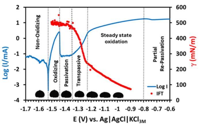 再鈍化階段:在更高電位下,表麵部分重新鈍化,表麵張力略有回升,液滴變形的趨勢得到一定抑製,推測是表麵形成了新的氧化層薄膜。