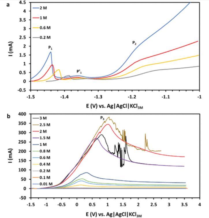 圖4(a)镓銦合金在不同濃度NaOH中的近鈍化區伏安圖。(b)镓銦合金在不同濃度NaOH中的完整線性掃描伏安圖,掃描速率為100 mV/s。
