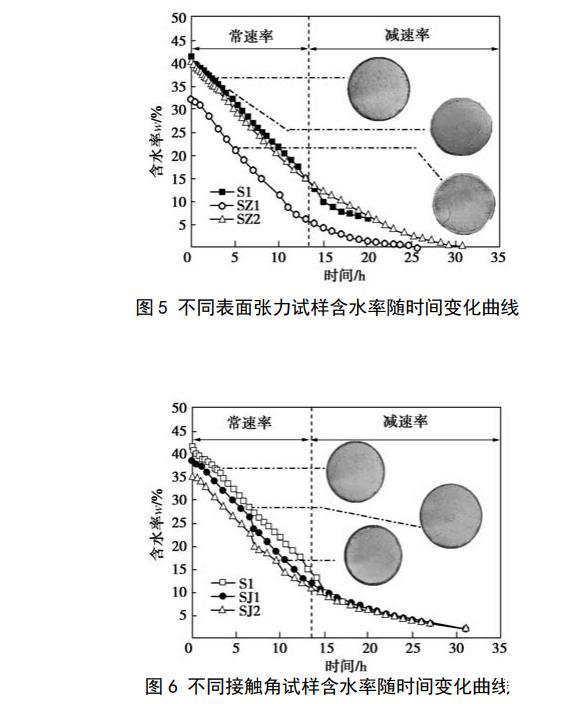 把篩好的土放入105℃烘箱內烘至恒重備用。設計土樣的幹密度為1.5 g/cm3,含水率計算不考慮酒精溶液和肥皂水引起的液體密度變化,製樣含水率為16%~18%。采用輕型擊實儀製圓柱試樣,試樣直徑為102 mm,高40 mm,試樣製好後用真空飽和法進行飽和,其中,SZ1樣用20%酒精溶液飽和,SZ2樣用濃度為2 g/L的肥皂水飽和,其餘試樣均為純水飽和,抽氣時間為6 h,試樣在真空下的浸泡時間為12 h。為縮短試樣的脫濕時間以減小酒精揮發造成的濃度降低,飽和試樣脫濕采用低溫烘幹法,烘箱的溫度控製在50℃(小於酒精的沸點和十八胺的熔點),當2h內試樣的質量變化量不超過2 g時停止試驗。試驗開始後,前8 h每隔30 min把試樣從烘箱中取出後先稱重,隨後進行拍照記錄,稱重和拍照的時間控製在30s內,拍照結束後把試樣放入烘箱繼續脫濕,6 h以後拍照間隔時間增加為1 h。2試驗結果2.1水分蒸發與臨界含水率圖5給出了不同表麵張力的3種試樣含水率隨時間變化的關係曲線。