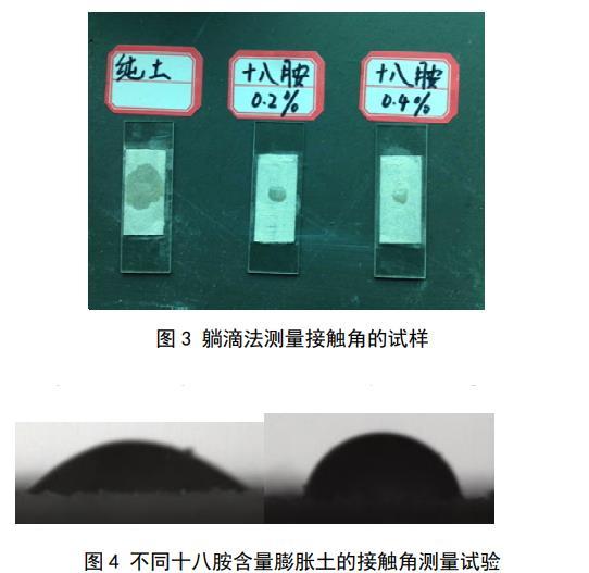 目前測量粉體接觸角(包括土顆粒)的方法主要有3種:躺滴法、毛細管上升法和Wilhelmy平板法,其中,躺滴法測出的接觸角為介於前進接觸角和後退接觸角之間的表觀接觸角,毛細管上升法測出的接觸角為前進接觸角,Wilhelmy平板法測出的接觸角為前進接觸角或後退接觸角。土體開裂是一個相對較慢的過程,因此土顆粒與孔隙水的接觸角大部分時間應該處於前進接觸和後退接觸角之間的某一表觀接觸角。所以,本文采用躺滴法對土顆粒接觸角進行測量。土樣烘幹後過0.075 mm的篩,取長度為4 cm左右的雙麵膠帶貼到載玻片上,將篩好的土顆粒均勻覆蓋載玻片,並用重量為200 g的砝碼壓住載玻片,持續時間為2 min,移開砝碼後反複輕輕磕碰載玻片以去除多餘的土顆粒,直到膠帶表麵覆蓋有一層薄薄的土顆粒,且土顆粒分布均勻無明顯凸起。如圖3所示,當水滴滴到被純土覆蓋的膠帶上時,液滴迅速擴散開,此時土顆粒的親水性很好,接觸角趨近於0。水滴滴到另外兩個覆蓋著混有十八胺土樣的載玻片時,形成了小液滴,此時固–液界麵和氣–液界麵之間的夾角不為0,把這2塊載玻片分別放到試驗台上進行液滴在土顆粒表麵的表觀接觸角測量,液滴初始體積為5μL,測量儀器為JC2000型接觸角測量儀,如圖4所示,每個土樣的接觸角反複測量5次後取平均值。十八胺含量為0.2%土樣的接觸角為30.5°,十八胺含量為0.4%土樣的接觸角為60.2°。