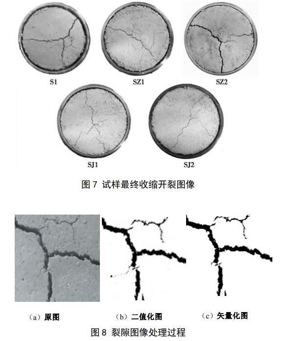 圖7給出了5個試樣在脫濕結束後對應的收縮開裂圖像。從圖中可以看出,每個試樣均出現了不同程度的收縮裂隙,各試樣表麵裂隙最終形態具有大致相似的規律:3條裂隙相交於一點,把圓形表麵分成了3個部分,S1樣和SZ2樣的裂隙較寬,試樣開裂明顯,其餘試樣裂隙發育不明顯,裂隙在形成過程中先形成一條主裂隙,主裂隙發育過程中支裂隙開始發育,最終支裂隙和主裂隙相交形成3條裂隙。S1樣和SZ1樣不僅出現了裂隙,在試樣和鋼環接觸的地方還出現了明顯的分離,試樣出現了體縮,其餘試樣也出現了不同程度的體縮,但並不明顯。為得到試樣的裂隙度,先要對采集到的試驗開裂圖片進行圖像處理,如圖8所示,先對采集到的膨脹土幹縮過程圖像進行二值化,去除一些非裂隙雜點,再把二值化圖像進行矢量化,矢量化後的圖像通過AUTOCAD提取試樣收縮麵積和裂隙麵積,最後計算出試樣的收縮開裂裂隙度: