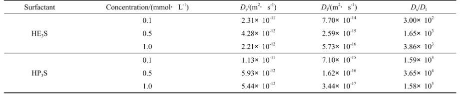 表2 HE3S和HP3S不同濃度水溶液的擴散係數及其比值