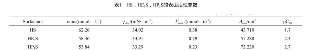 由圖4中的γ-c曲線按照文獻計算方法,可以求得3種表麵活性劑的cmc、γcmc、pC20(其物理意義為使得溶液表麵張力降低20 mN/m時的表麵活性劑濃度的負對數)、平衡吸附量(Гcmc)和水化分子截麵積(Amin),其具體數值列於表1。由表1可看出,相比於HS,HE3S和HP3S由於烷氧基團的插入,導致極性頭基的體積變大,在溶液中的排列變分散,從而在一定程度上降低了表麵活性劑的cmc和γcmc。另外在親水基團和疏水鏈之間嵌入烷氧基團,而且烷氧基團呈卷曲狀結構,這兩個因素都導致Гcmc降低,Amin增大。Dahanayake等提出了參數pC20,用以表示表麵活性劑的吸附效率,pC20值越大,吸附效率越高。由表1還可看出,烷氧基團的嵌入可顯著增加其吸附效率,這與分子結構決定的HLB值具有密切關係。