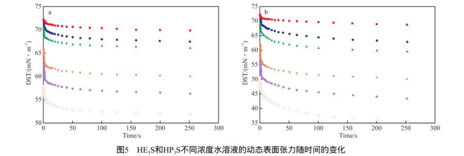 圖5為298 K時不同濃度的HE3S和HP3S水溶液的動態表麵張力隨時間的變化。