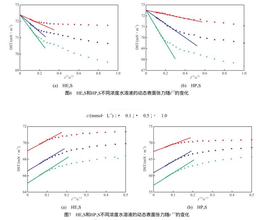 圖7 HE3S和HP3S不同濃度水溶液的動態表麵張力隨t-1/2的變化