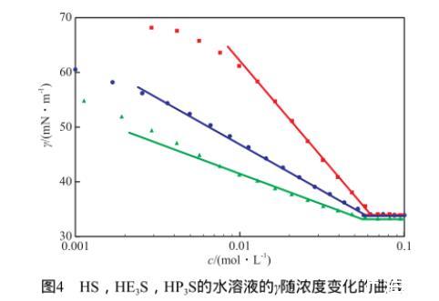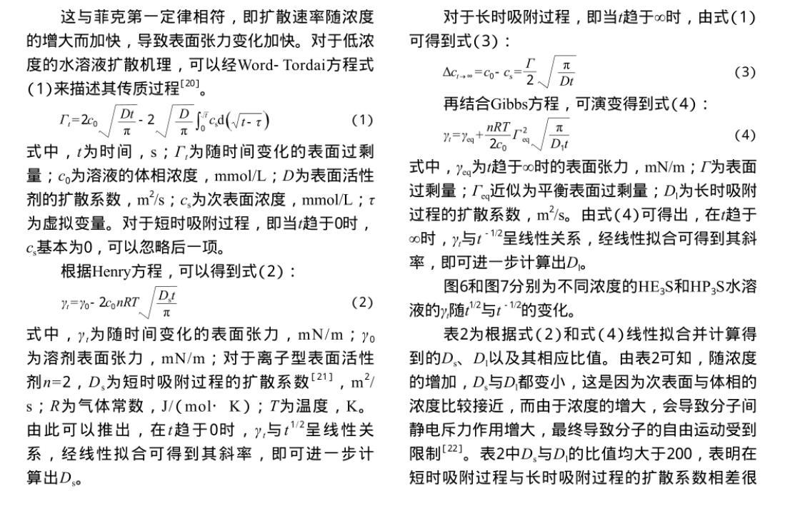 2)水溶液中的HE3S和HP3S分子可以快速擴散到氣-液界麵,迅速降低表麵張力並達到平衡值,對於低濃度水溶液,這兩種表麵活性劑的吸附過程都屬於混合動力控製吸附。