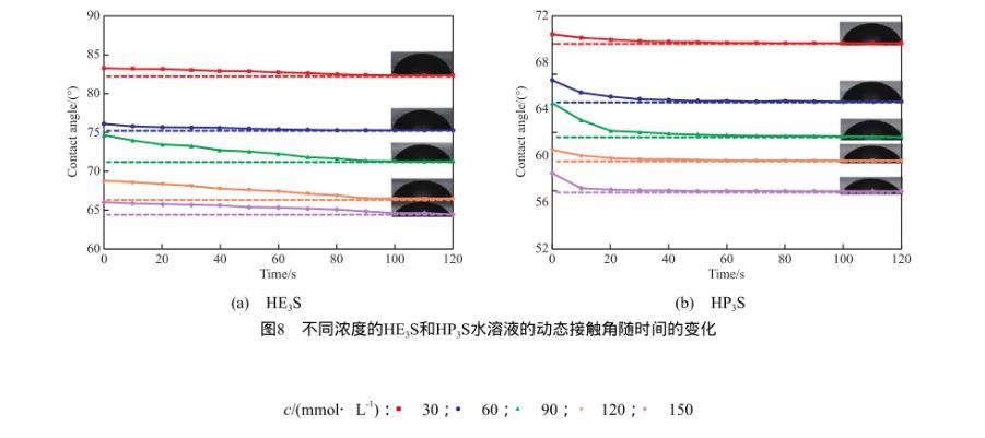 3)當溶液濃度為150 mmol/L時,HE3S和HP3S的水溶液液滴可在石蠟膜上快速鋪展,該性質與其動態表麵張力結果相對應。而且在一定濃度範圍內隨濃度增大,液滴可以更快的達到更低的接觸角,其最低接觸角分別達到64.5°和55.9°。