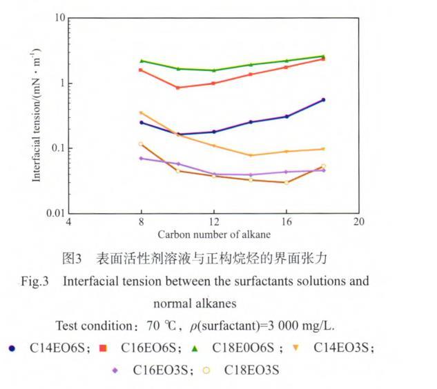用模擬臨盤油田地層水將脂肪醇聚氧乙烯醚磺酸鹽配製成質量濃度為3 000 mg/L的溶液,在70℃下測得C14EO3S,C16EO3S,C18EO3S表麵活性劑與原油間的界麵張力分別為0.076,0.041,0.034 mN/m。表麵活性劑溶液與正構烷烴的界麵張力見圖3。