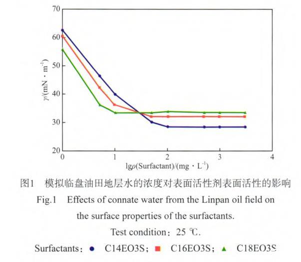 圖1模擬臨盤油田地層水的濃度對表麵活性劑表麵活性的影響