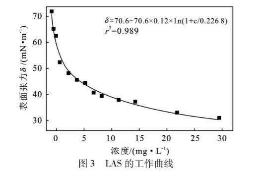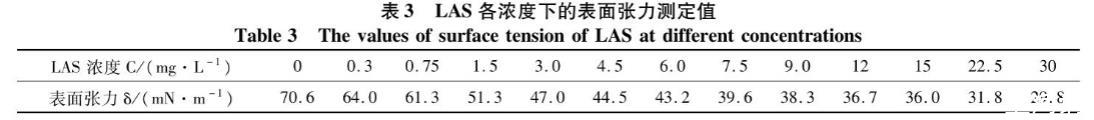 表3 LAS各濃度下的表麵張力測定值
