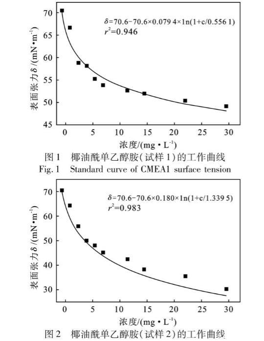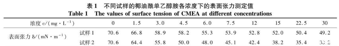 椰油酰單乙醇胺溶液的表麵張力測定結果見表1。