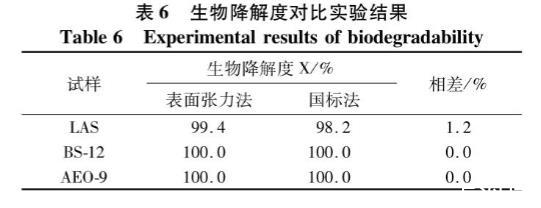 對比兩種方法得出的生物降解度,由表6可知,表麵張力法計算得出的生物降解度比國標法測定的結果偏高或者一致,兩者相差小於2%,可認為兩種方法均可測定表麵活性劑的生物降解度,其結果均可信。