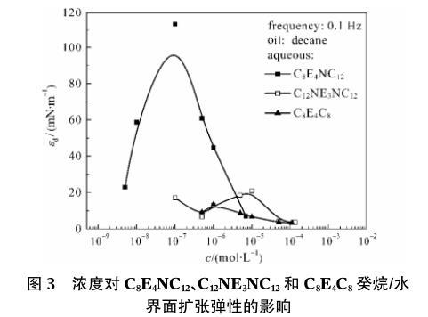 圖3濃度對C8E4NC12、C12NE3NC12和C8E4C8癸烷/水界麵擴張彈性的影響