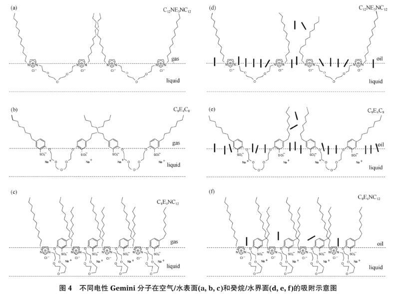 圖4不同電性Gemini分子在空氣/水表麵(a,b,c)和癸烷/水界麵(d,e,f)的吸附示意圖