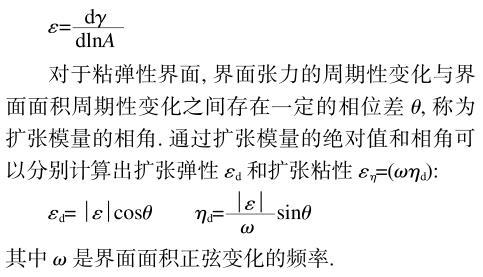 當界麵受到周期性壓縮和擴張時,界麵張力也隨之發生周期性變化,擴張模量ε定義為界麵張力(γ)變化相對於相對界麵麵積(A)變化的比值。即