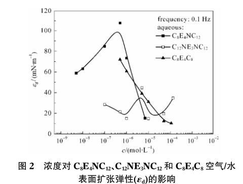 圖2濃度對C8E4NC12、C12NE3NC12和C8E4C8空氣/水表麵擴張彈性(εd)的影響