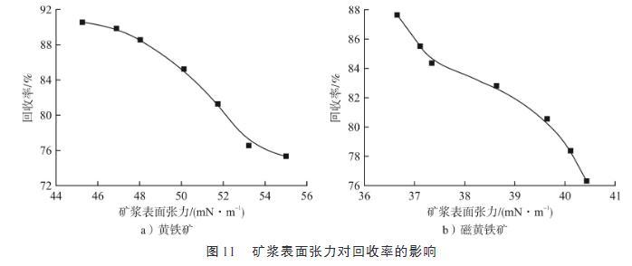 4)通過考察礦漿表麵張力對浮選回收率的影響可知,礦漿表麵張力與浮選回收率成反比關係,隨著礦漿表麵張力的降低,黃鐵礦與磁黃鐵礦的回收率均顯著增加。這一規律可以用於指導生產實踐,即在硫化礦浮選中,可以嚐試通過降低礦漿表麵張力來改善硫化礦的回收效果。