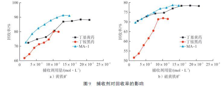 由圖9可知:黃鐵礦與磁黃鐵礦的回收率整體均隨著捕收劑用量的增加而逐漸提升;當回收率達到峰值後,繼續增加捕收劑用量,回收率趨於穩定狀態。相較於丁銨黑藥和丁基黃藥,MA-1作為黃鐵礦的捕收劑性能更佳。在磁黃鐵礦的浮選過程中,使用丁基黃藥和MA-1作為捕收劑時,回收率差異不顯著。鑒於實際生產過程中簡化藥劑製度和降低藥劑成本的考量,丁基黃藥更適宜作為磁黃鐵礦捕收劑。