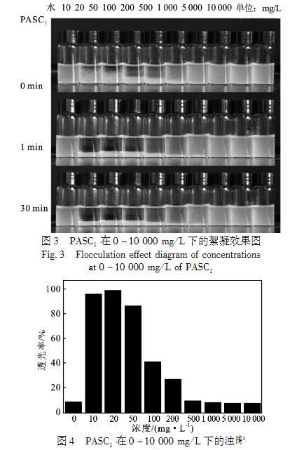 PASC1的絮凝效果見圖3、圖4.PASC1濃度為10——50mg/L時,透過率接近100%,繼續增加PASC1的濃度,體係重新變得渾濁。隨著PASC1濃度的進一步增加,體係的透過率降低,粘土顆粒懸浮體係重新穩定。粘土顆粒的表麵由於同構取代而帶負電荷,這意味著需要陽離子達到電荷平衡。對於鈉基膨潤土(Na——BT),Na+離子被吸引到層空間中。當Na——BT與水接觸時,水可進入晶層內部,使可交換陽離子解離,在晶層表麵建立擴散雙電層,從而產生負電性。
