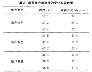 從實驗分析數據得知陶瓷墨水的表麵張力隨溫度的升高而下降,但是,在陶瓷墨水的正常使用溫度內(35~45℃)變化不明顯,基本不影響陶瓷墨水的表麵張力性能。實驗也得出國產墨水與進口墨水的表麵張力參數基本一致,由於表麵張力會影響到墨滴的形成狀態,所以國產墨水與進口墨水的打印墨滴基本相接近。