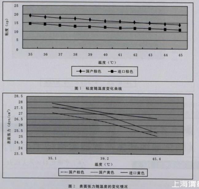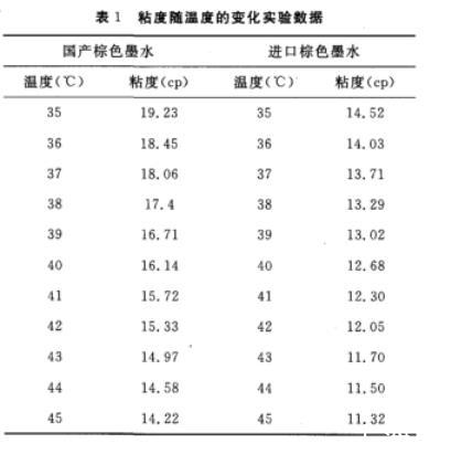 3)進口陶瓷墨水與國產陶瓷墨水相比,內在的性能參數(表麵張力、粘度、容重)隨溫度變化的規律一致。