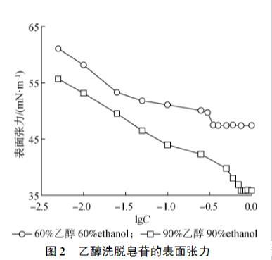 60%乙醇溶液洗脫得到皂苷的得率為39.03%,90%乙醇溶液洗脫得到皂苷的得率為5.01%。由圖2可知,60%乙醇溶液洗脫得到的皂苷臨界膠束濃度為0.35 g/L,最低表麵張力為47.43 mN/m;而90%乙醇溶液洗脫得到的皂苷臨界膠束濃度為0.75 g/L,最低表麵張力為35.83 mN/m。可以看出,90%乙醇洗脫得到的皂苷臨界膠束濃度更高,最低表麵張力更低。說明苷元含量越高,其臨界膠束濃度越大,最低表麵張力越小。