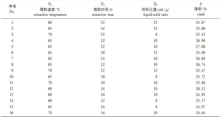 通過軟件分析得到肥皂莢皂苷的最優提取條件為:溫度69.20℃、時間11.28 h、液料比值9.89,皂苷得率的預測值為26.44%。為了操作方便,修正提取條件為:溫度69℃、時間11 h 15 min、液料比值為10。在此條件下對肥皂莢皂苷進行水浸提,並做3次重複性實驗,平均得率為26.49%,與理論值誤差僅為0.05%。表明該模型可以較好地預測肥皂莢皂苷的提取工藝。