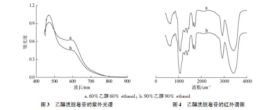 2種皂苷的紫外和紅外光譜見圖3和圖4。由圖3可知,2種皂苷樣品的紫外最大吸收波長均在470 nm附近,且60%乙醇洗脫得到的皂苷吸光度低於90%乙醇洗脫得到的皂苷。