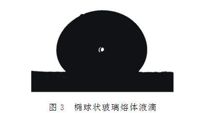 將製備的玻璃樣塊用錫紙包裹,用鐵錘捶碎後用鉗子修整成較方正的顆粒,選取內部無氣泡結石且質量為0.15~0.30g的碎塊用於測試。測試前選用T4溫度表麵張力為334 mN/m的標準鈉鈣玻璃校準表麵張力測量儀。測試的具體操作步驟如下:將表麵張力測量儀加熱爐升溫至測量溫度,通入高純氮氣作為保護氣體,然後將製備好的玻璃樣品置於石墨片上,送入加熱爐中的樣品台上進行保溫,試樣在表麵張力作用下收縮成橢球狀液滴,如圖3所示,將液滴置於拍攝裝置視野中心,保溫30 min至熔體穩定。隨後,用圖像采集裝置獲取橢球熔體的外輪廓線,通過軟件數值分析得到輪廓參數,利用Young-Laplace方程進行解析,計算出樣品的表麵張力(σ),反複測試若幹次後取σ的平均值為樣品在該測試條件下的表麵張力值。