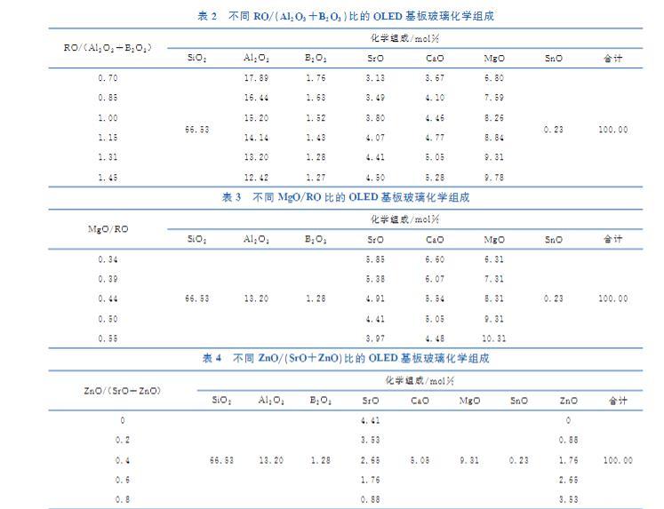 根據開發需求,本文設計了四組不同化學組成的OLED基板玻璃。如表1~表4所示,分別通過改變組成中的Al₂O₃/SiO₂、RO/(Al₂O₃+B₂O₃)、MgO/RO和ZnO/(SrO+ZnO),研究表麵惰性組分和表麵活性組分的相對含量,以及同堿土金屬氧化物網絡作用相似但活性更強的過渡金屬氧化物對無堿鋁矽酸鹽玻璃表麵張力的影響。