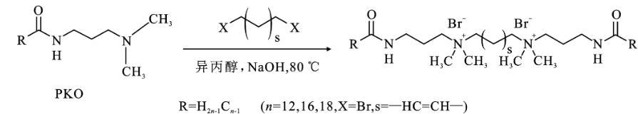 根據前期的工作[2-4]。在圓底燒瓶中,先將0.1 mol連接基化合物,反-1,4-二溴-2-丁烯溶於100 mL異丙醇中。將0.2 mol脂肪酸酰胺丙基二甲胺(PKO-12、PKO-16、PKO-18)加入反應溶液中,並以氫氧化鈉0.4 g作為催化劑加速反應,在80℃下攪拌12 h。反應結束後,用真空蒸發去除溶劑,得到蠟狀的粗產物。將得到的蠟狀粗品固體在乙酸乙酯/乙醇(20∶1)混合溶劑中重結晶3次,得到白色粉末狀陽離子Gemini表麵活性劑。所製備的Gemini表麵活性劑(GS-12,GS-16,GS-18)的產率分別為93.5%,92.4%,94.1%。Gemini表麵活性劑GS-12,GS-16,GS-18的合成路線如下: