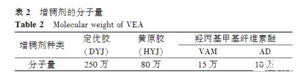 本工作采用多種增稠劑對砂漿的黏度進行調整,分別為天然植物多糖類增稠劑(定優膠和黃原膠)和合成纖維素醚類增稠劑(羥丙基甲基纖維素醚)兩大類,各自的分子量列於表2中。