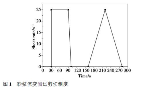 砂漿的流變測試使用Brookfield R/S SST2000流變儀,將測試流動度之後的砂漿立即置於流變儀中,選定設置好的剪切製度後開始測試,剪切製度設置如圖1所示。具體過程描述如下:靜置30s後,在剪切速率25s⁻¹下勻速預剪切60s;然後剪切速率在10s內勻速下降至0s⁻¹;靜置60s後,剪切速率以斜坡式在60s內逐漸從0s⁻¹提高至25s⁻¹,然後再以斜坡式在60s從25s⁻¹下降到0,采集60個數據點。采用剪切速率從25s⁻¹下降到0s⁻¹的過程中的屈服應力和表觀黏度作為分析砂漿流變性能的數據。