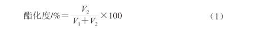 稱取100 mg不同脫酯果膠溶解於30 mL去離子水中,攪拌過夜。滴定前向果膠溶液中滴加3滴酚酞作為指示劑,用0.1 mol/L氫氧化鈉滴定液將果膠溶液滴定至顏色變為粉紅色,記錄消耗的滴定液體積V1。向體係中加入10 mL 0.1 mol/L氫氧化鈉溶液,脫酯15 min後,再加入10 mL 0.1 mol/L鹽酸溶液。然後用0.1 mol/L氫氧化鈉滴定液滴定體係中過量的鹽酸,直至顏色變為粉紅色,記錄滴定液消耗量(V2)。按式(1)計算果膠酯化度: