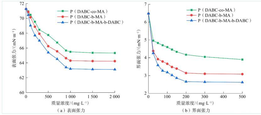 結果表明,所有共聚物均能有效降低表界麵張力,具備兩親性。但嵌段共聚物,特別是三嵌段結構,降低張力的能力和效率顯著優於無規共聚物。