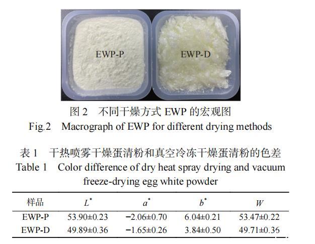 如圖2所示,EWP-P為細膩的鵝黃色顆粒粉末,EWP-D為鬆散的黃色片狀物。EWP-P的L*、a*和b*值分別為53.90±0.23、−2.06±0.70和6.04±0.21。EWP-D的L*、a*和b*值分別為49.89±0.36、−1.65±0.26和3.84±0.50(表1)。EWP-P的b*值較大是因為蛋清蛋白中的葡萄糖在噴霧幹燥過程中與蛋白發生了美拉德反應。此外,真空冷凍幹燥需將樣品進行冷凍預處理,冷凍過程中,蛋清蛋白會發生褐變反應,故EWP-D最終呈現出的顏色較EWP-P黃(圖2)。EWP-P的顏色較EWP-D白(圖2),可能是因為幹熱噴霧幹燥的幹燥速度快,蛋清中的蛋白質受熱時間短。因此在本實驗幹燥條件下,幹熱噴霧幹燥所得的蛋清蛋白粉更亮、更白,易被消費者接受。