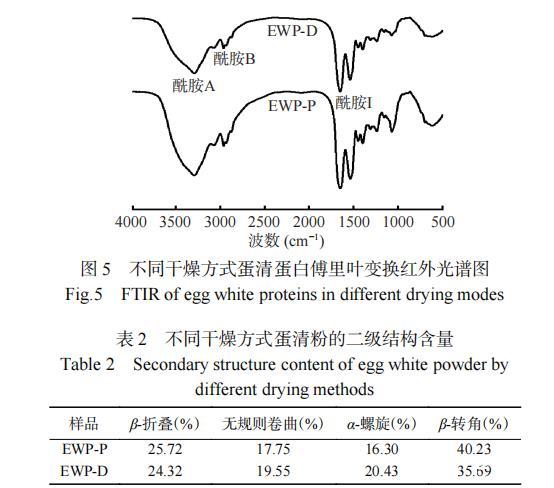 不同幹燥方式蛋清蛋白的紅外光譜如圖5所示。EWP-P和EWP-D在酰胺A帶(3700~3200 cm−1)處有強吸收峰,EWP-P的峰強大於EWP-D,表明幹燥方式會影響蛋清蛋白的水合能力,這可能與蛋白質分子中N-H鍵舒展並與氫鍵形成了締合體,或蛋白質分子與葡萄糖以共價鍵結合有關。酰胺B帶(2961.64 cm−1)的弱吸收峰主要由C-N鍵產生。酰胺I帶(1600~1700 cm−1)信號主要由C-O鍵伸縮振動引起,與蛋白質的二級結構有關,涉及β-折疊(1600~1640 cm−1)、無規則卷曲(1640~1650 cm−1)、α-螺旋(1650~1660 cm−1)和β-轉角(1660~1700 cm−1)。采用Peak fit軟件對不同幹燥方式蛋清蛋白的酰胺I帶峰強進行高斯曲線擬合分析,根據峰麵積計算其二級結構的相對百分含量,結果如表2。EWP-P和EWP-D的二級結構以β-折疊和β-轉角為主,EWP-P的β-折疊含量增加主要與卵轉鐵蛋白熱變性有關,同時分子間的β-折疊結構也易轉變為β-轉角結構。而α-螺旋下降可能是因為熱變性導致α-螺旋中的氫鍵斷裂,進而發生了解螺旋現象。EWP-P無規則卷曲增加,表明其部分有序結構向無規則卷曲轉化,蛋白變性明顯,結構的隨機性增強。