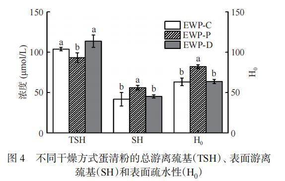 圖4不同幹燥方式蛋清粉的總遊離巰基(TSH)、表麵遊離巰基(SH)和表麵疏水性(H0)