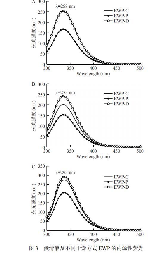蛋白質的固有熒光來自於內部的芳香族氨基殘基(酪氨酸Tyr、色氨酸Trp、苯丙氨酸Phe),其熒光最大值(λmax)、強度對其微環境的極性極其敏感,因此可用來表征蛋白質的三級結構變化,其中Trp、Tyr和Phe的特有熒光激發波長分別為295、275和258 nm。如圖3所示,與EWP-C相比,不同幹燥方式製備的蛋清粉的固有熒光強度降低但熒光峰的位置未有明顯的遷移。EWP-P的熒光強度低於EWP-D於EWP-C,可能是因為噴霧幹燥的幹燥溫度高,蛋清蛋白變性程度大,芳香族氨基酸殘基暴露於更極性環境中,進而發生了熒光猝滅現象。此外,EWP-P的熒光強度較低還可能是由於蛋清蛋白中含有葡萄糖,在高溫下會與蛋白質發生美拉德反應,屏蔽了芳香族氨基殘基。