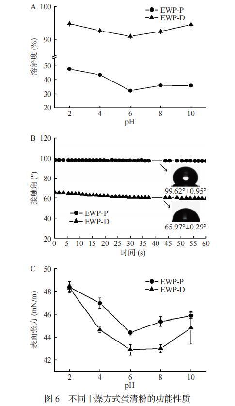 溶解性是蛋白重要的功能特性之一,與接觸角、表麵張力、乳化性等密切相關。如圖6A,不同pH下不同幹燥方式的蛋清粉溶解度的測量。EWP-P的溶解度隨著pH的升高先減小後增大,這可能是因為在酸性和堿性環境中球狀蛋白質會發生部分展開,形成熔融球狀構象,變得更加靈活,更容易與水分子作用。pH為6.0時蛋清蛋白的溶解度最低,可能是因為該pH與蛋清蛋白中大部分蛋白的等電點相近,蛋白帶電荷量較少,因此容易發生沉澱。與EWP-P相比,EWP-D在pH6.0時溶解度的下降程度較小,這可能與真空冷凍幹燥後蛋清蛋白的微觀結構呈片狀,具有較大的比表麵積有關,也可能是因為冷凍幹燥蛋白質在脫水過程中蛋白質變性低,促進了可溶性聚集物生成。EWP-D的溶解度遠大於EWP-P,這是因為噴霧幹燥是直接將蛋清液霧化後再幹燥,其蛋清粉表麵會形成一個光滑、抗濕性的薄膜,最終導致蛋白的溶解性降低,複水性差且易結塊。而真空冷凍幹燥經過冷凍升華,可保持食品原有的形狀故具有很好的速溶性和複水性。Shaviklo等也發現噴霧幹燥的含添加劑(花粉)蛋白的蛋白質溶解度明顯低於凍幹蛋白。