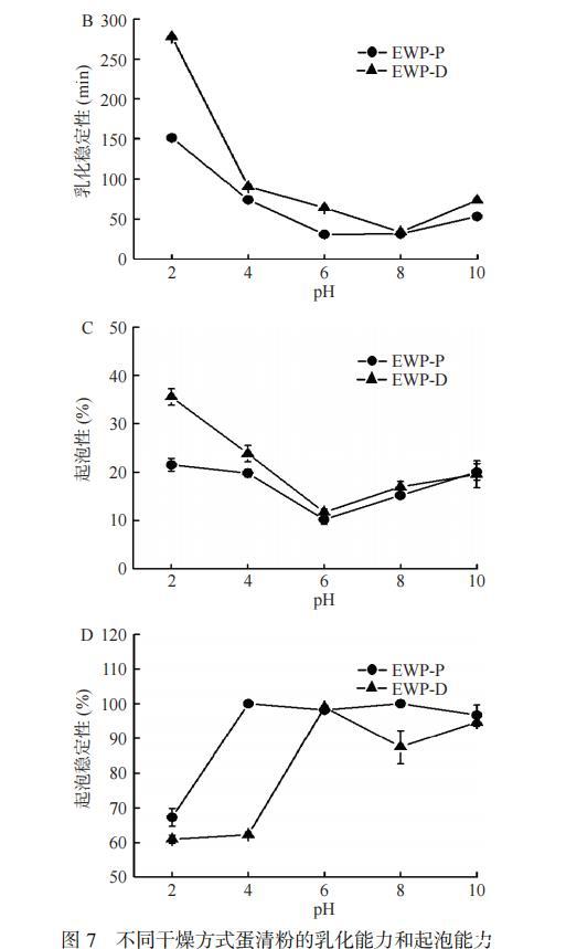 泡沫的形成依賴於由蛋白質形成的界麵膜及其在懸浮液中保持氣泡和減緩聚結速率的能力,其中蛋白質的發泡能力和穩定性與蛋白與水相在界麵上的相互作用有關,受蛋白分子柔性、淨電荷、構象和疏水性的影響。蛋清蛋白在pH2.0~10.0條件下的起泡性如圖7C所示,EWP-D的起泡性優於EWP-P,這可能是由於EWP-D的溶解度較高,在起泡過程中蛋白能迅速展開,形成能同時連接水相溶劑與空氣界麵的兩性介質,而自身的帶電性又可產生一定的靜電排斥,使蛋白分子在空氣-水界麵上呈現規律性排列,而不會發生聚集。相比之下,EWP-P在高溫發生的美拉德反應會使蛋白形成更大的空間位阻,進而延緩了蛋白質在空氣/液體界麵的吸附。pH為6.0時,EWP-P和EWP-D的起泡性較低,分別是10.19%±1.01%和11.7%±0.66%,這是由於該pH下蛋白的溶解度和表麵張力較低,蛋白易發生聚集,故不易形成泡沫。