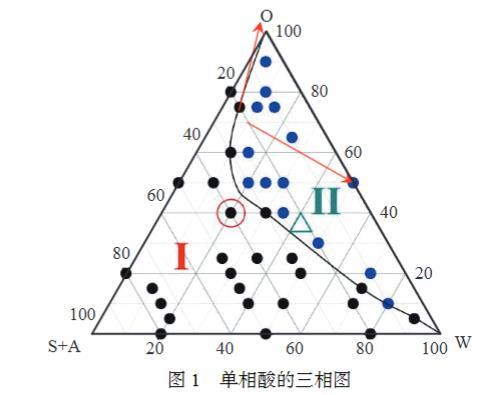 通過擬三元相圖製備單相酸相圖,根據油相(O)、酸相(W)、表麵活性劑(S)+助表麵活性劑(A)的比例進行三相圖的繪製。室溫下,固定油相(O)的加量,固定非離子表麵活性劑(S1)與陽離子表麵活性劑(S2)的質量比,固定表麵活性劑(S,S=S1+S2)與助表麵活性劑(A)的質量比。將不同比例下的液體進行離心,然後進行觀測,觀察體係由澄清透明(一相)變為混濁(二相)的相變過程,在每次發生相變的同時記錄所滴加鹽酸的量,以O、S+A、W為三相,繪製擬三元相圖,見圖1。由圖1可知,在圖1的紅圈標記區域,配方的經濟性最好,是維持單相區域最小的表麵活性劑用量(S+A),且該配方下的單相酸遇水遇油後仍可在較大範圍內保持單相。