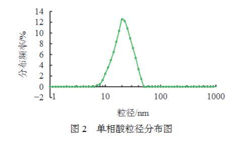 采用激光粒度分析儀對單相酸粒徑及分布進行了測定,實驗結果見圖2。可知單相酸粒徑大小分布在7~50 nm範圍之內,分布較窄,為高斯分布,在單相微乳粒徑範圍內。