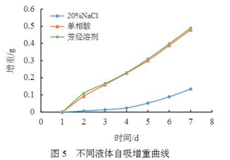 設置不同液體進行自吸實驗,對比親油岩心對於不同液體的自吸能力,實驗結果見圖5。對孔隙介質而言,潤濕性控製兩相或多相流體的分布和流動。平衡時濕潤相與孔隙表麵相互接觸,而非濕相占據孔隙的中央位置,介質中發生兩相或多相流動時,毛管力與濕相流動方向一致,是非濕相自發進入岩心介質驅替潤濕相的阻力,對於油濕岩心介質,很難發生水的自吸。從實驗結果可以看出,單相酸自吸效果和芳烴溶劑十分接近。