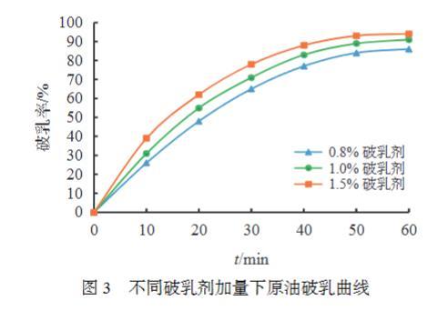 將單相酸與原油高速攪拌混合製備乳狀液,油水比3∶2。分別加入0.8%、1.0%、1.5%二酸二辛脂磺酸鈉破乳劑,水浴90℃,靜態放置,每隔10 min測量析出量,計算破乳率,實驗結果見圖3。加入1%破乳劑後,單相酸破乳率在1 h內可達到90%以上。
